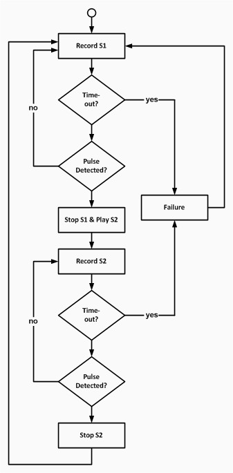 The application enters a failure state any time it fails to detect an expected sound pulse. It recovers from this condition, displays a failure message, and then enters the next measurement cycle normally. The following diagram shows the timeline when this occurs.
